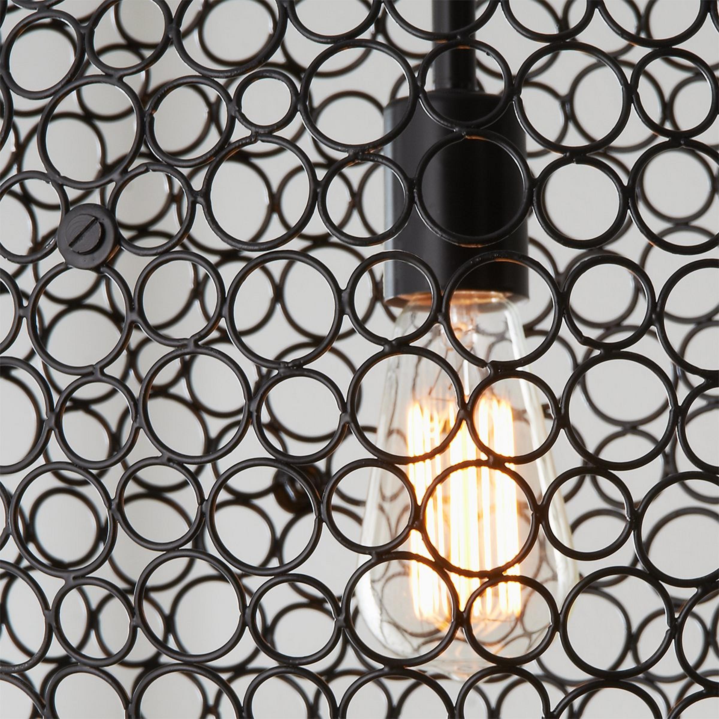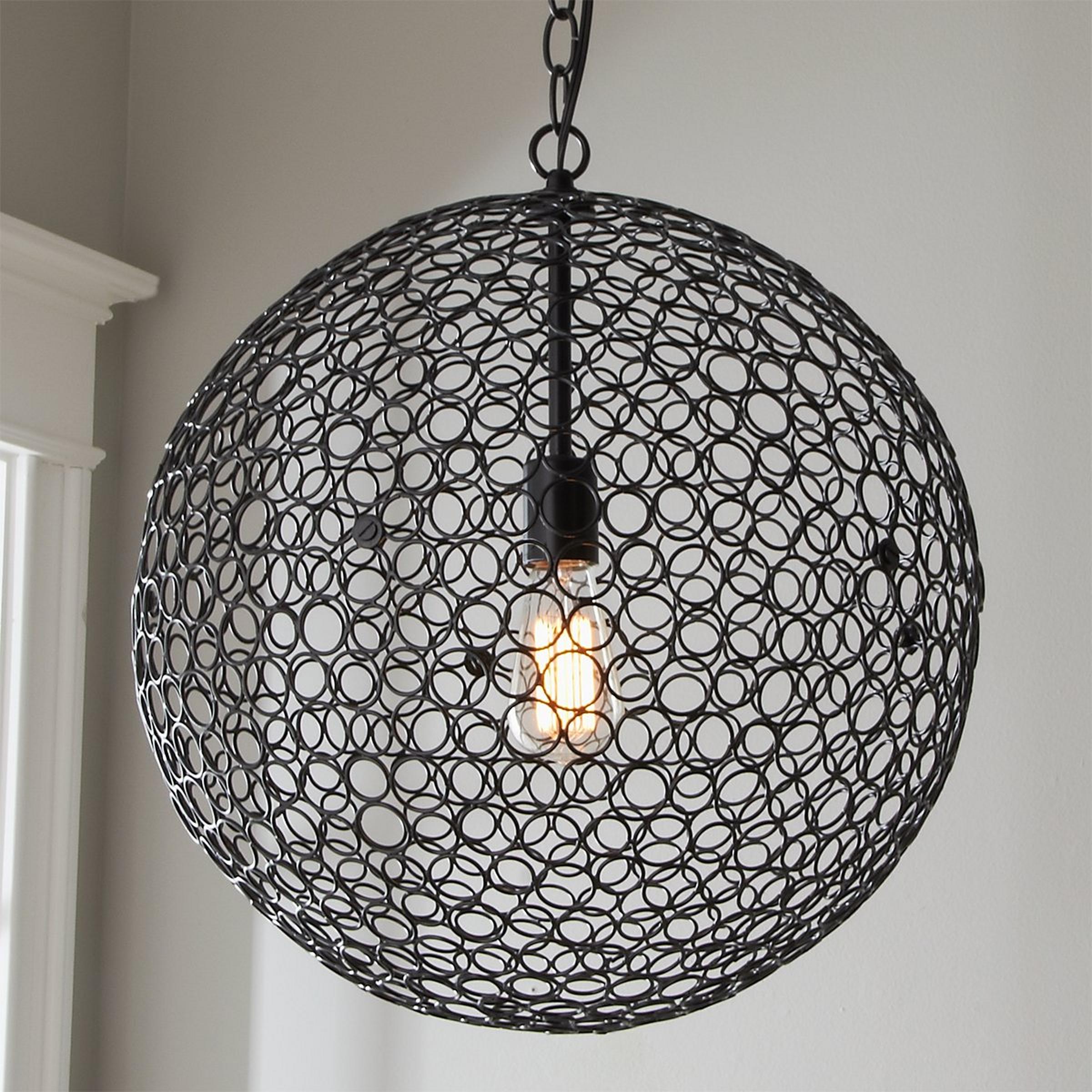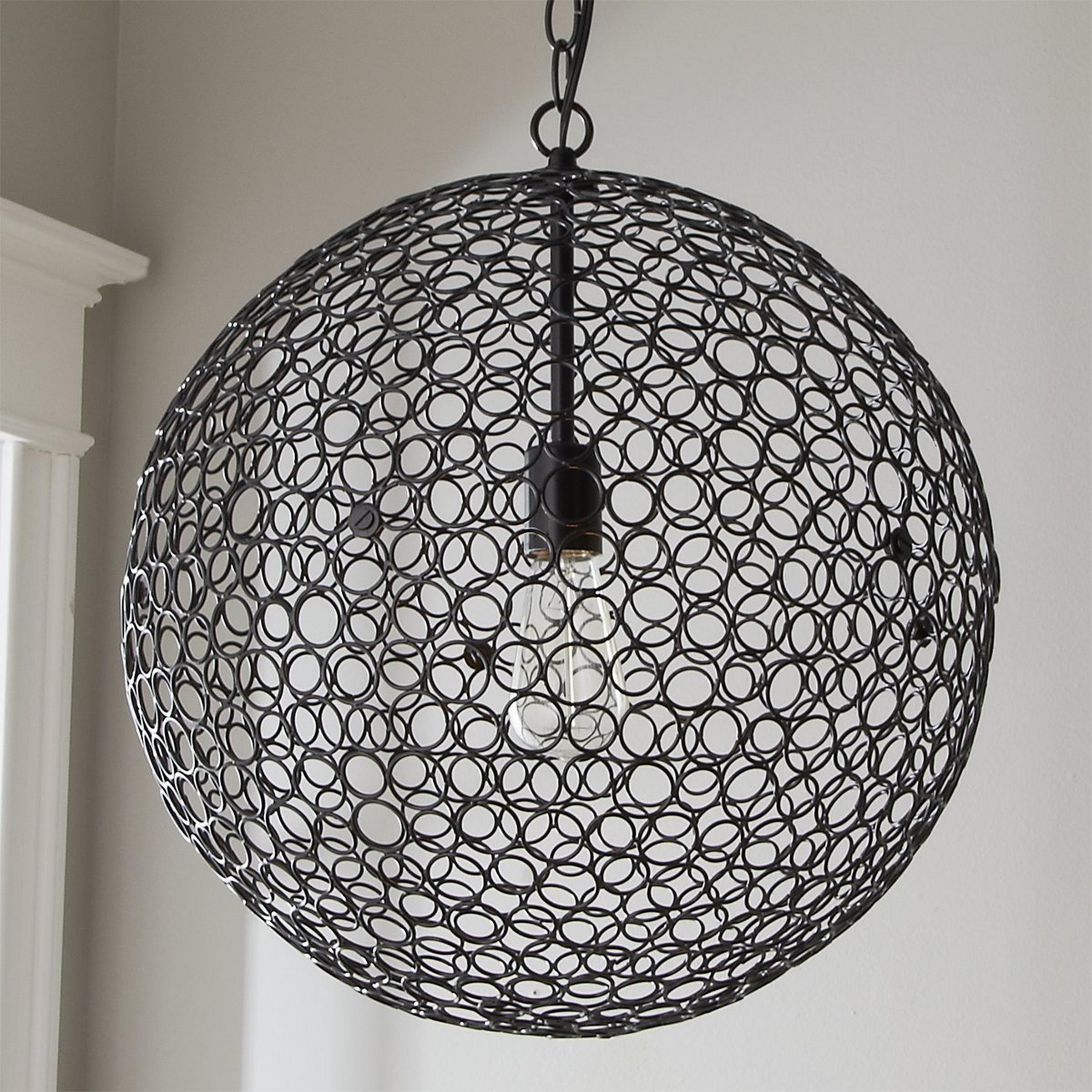 Steel rings form a lightweight metal mesh globe around a central lamp for a delicate statement fixture. This simple, modern lantern with a geometric pattern will add a timeless sophisticated touch to any decor. This exclusive Shades of Light design comes in multiple sizes and finishes to coordinate in different areas or create an artistic mix in a kitchen, bedroom, or dining room.